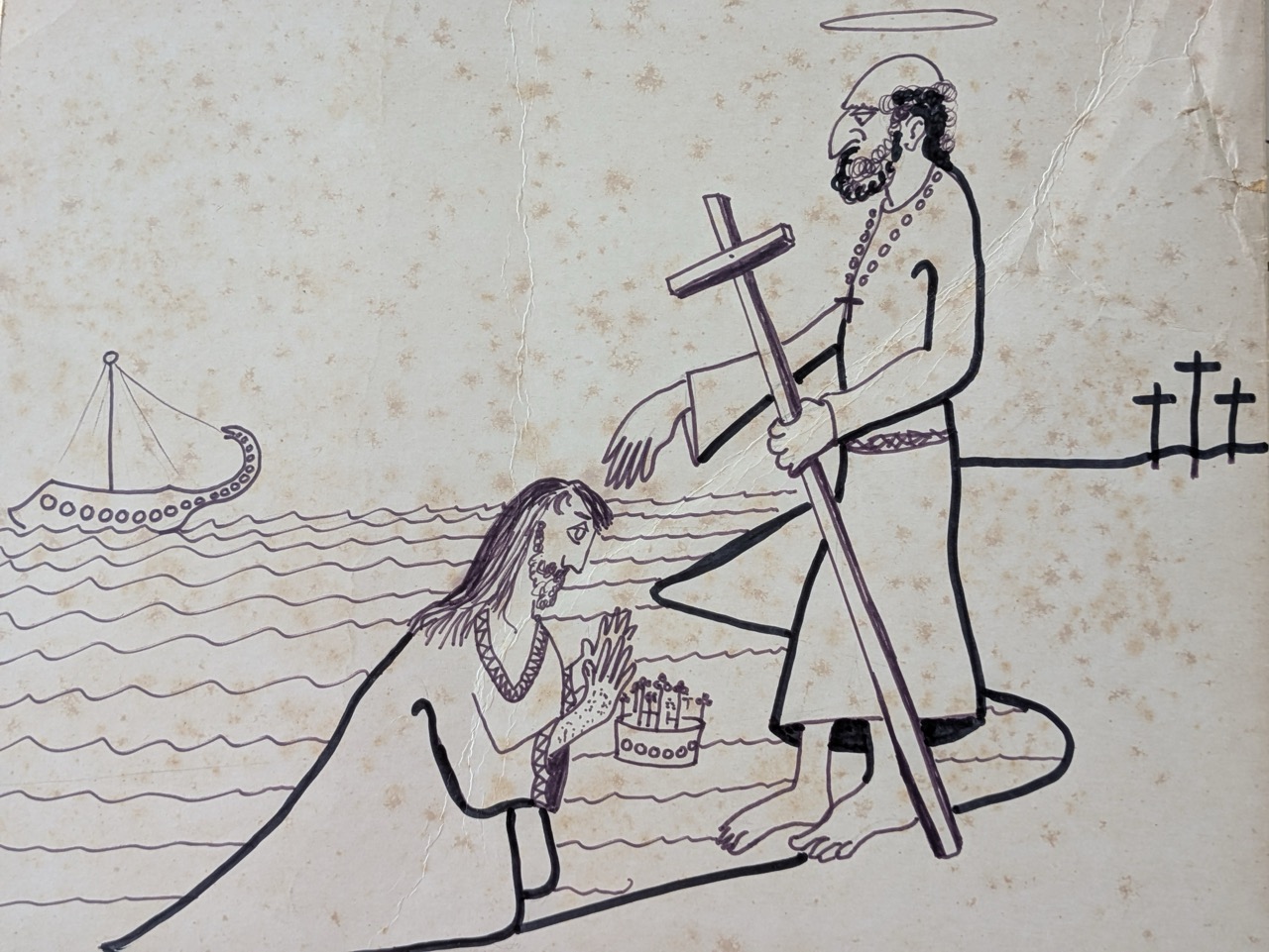 These are deceptively simple. Clear line. Minimal detail. Boats, halos, crowns, crosses. The scenes are immediately legible.