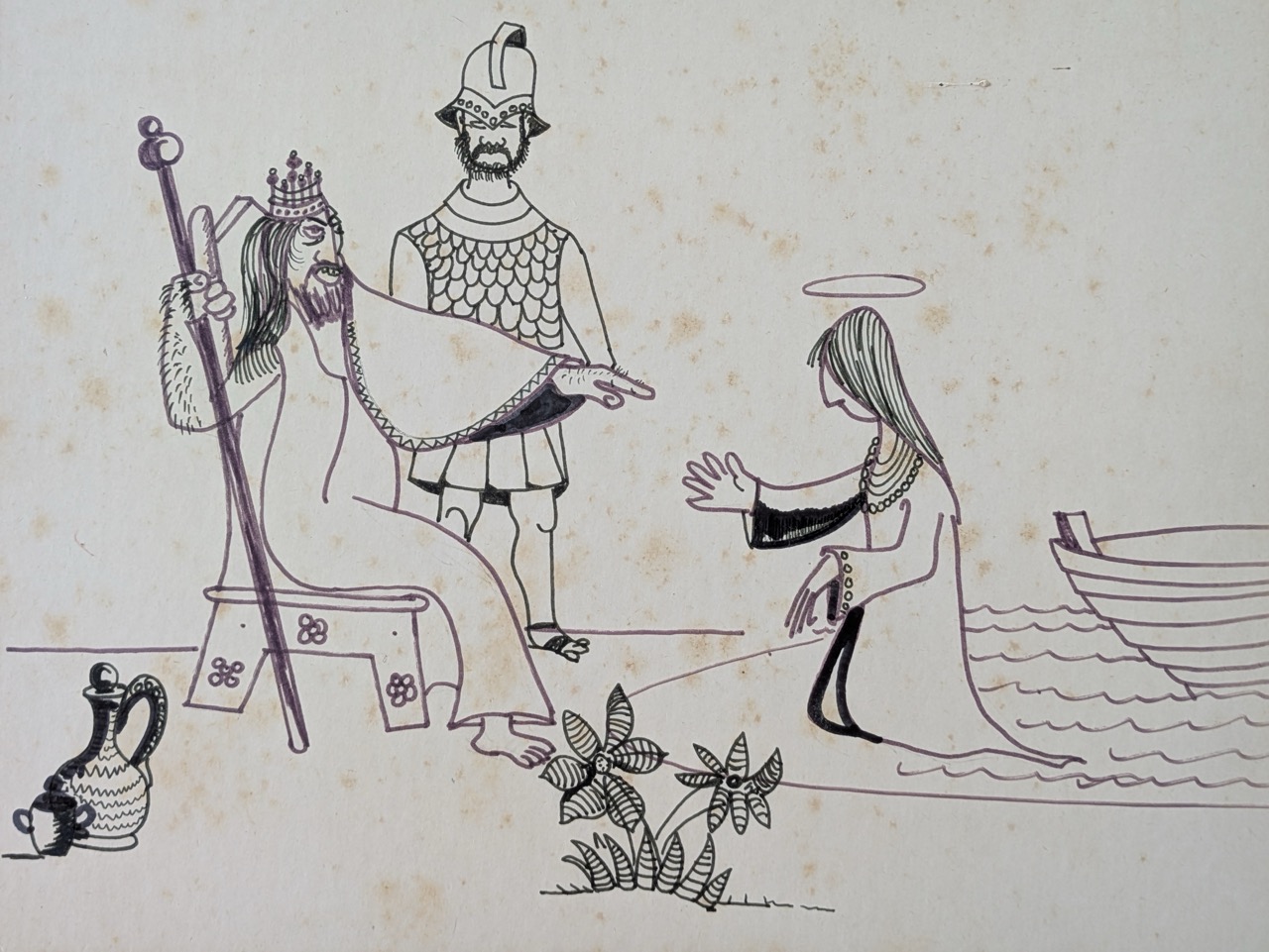 Alongside the Daisy Bates pictures, Gray also produced a series of cartoon-like drawings depicting scenes from the Bible.